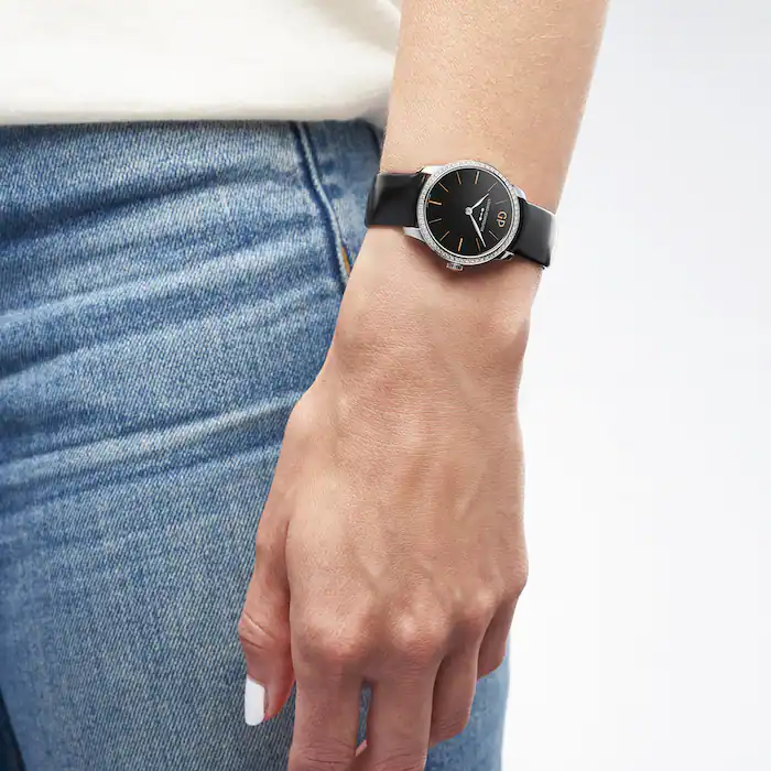 To match the infinite depth of the onyx dial, this elegant timepiece is paired with a polished calf leather strap and an uninterrupted bezel of 60 brilliant cut diamonds.