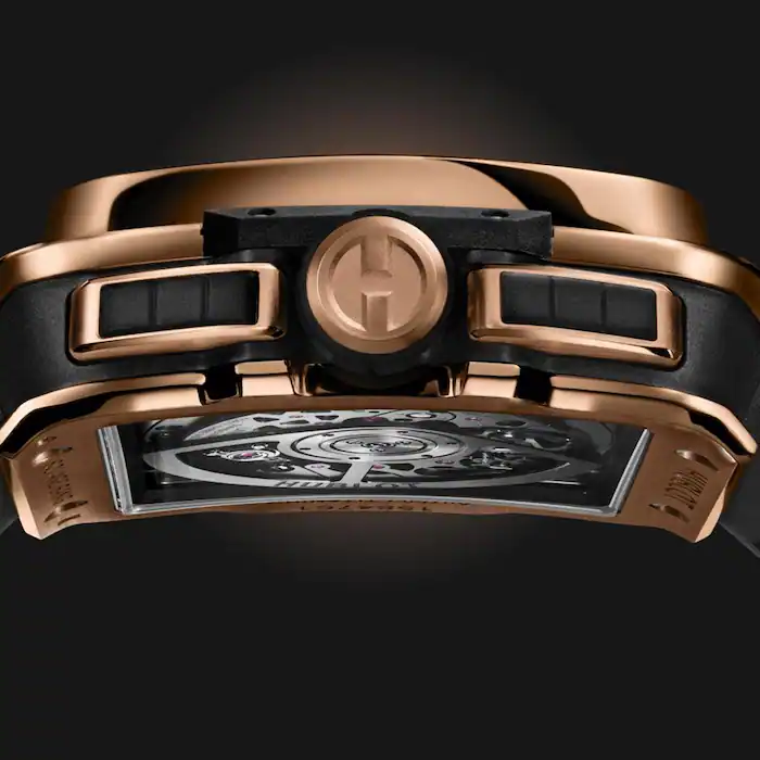 The satin-finished and polished gold bezel features 6 H-shaped titration screws, reflecting the technological developments of the piece.