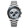 Housed a 42mm stainless steel case with a blue ceramic bezel, the watch fastens with a stainless steel bracelet secured with a triple safety folding clasp.