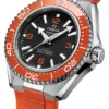 Powered by the Co-Axial Master Chronometer Calibre 8912, this Seamaster Planet Ocean is worn on an orange rubber strap with a stainless steel link to the case and a foldover clasp. On the reverse side of the watch, the screw-in caseback is made from polished-brushed grade 5 titanium, and displays OMEGA’s famous seahorse emblem
